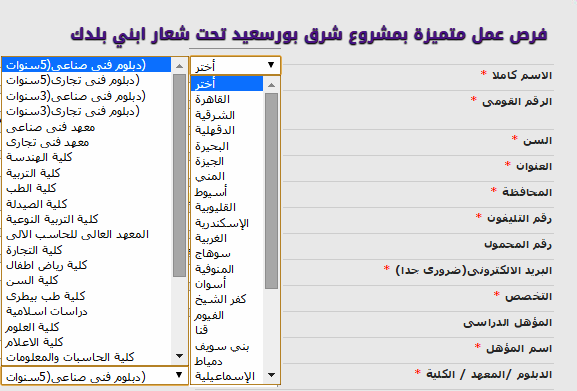 اعلان وظائف لكل المحافظات والمؤهلات العليا والدبلومات والاعدادية والابتدائية وبدون مؤهل بمشروع شرق بورسعيد سجل الان